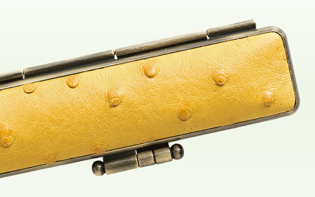 オーストリッチは、ご存知の通り、ダチョウの皮です。羽を抜いた後の丸い突起が牛皮など他の買わないは無い独特の風合いと模様になっています。強靱な皮質から高級ブランドなどでバッグの素材になるなど、評価の高い皮です。印鑑ケースの両面に部位の違うオーストリッチを使いました。色のバラエティも多く、オシャレかつリッチな気分を味わっていただけます。
